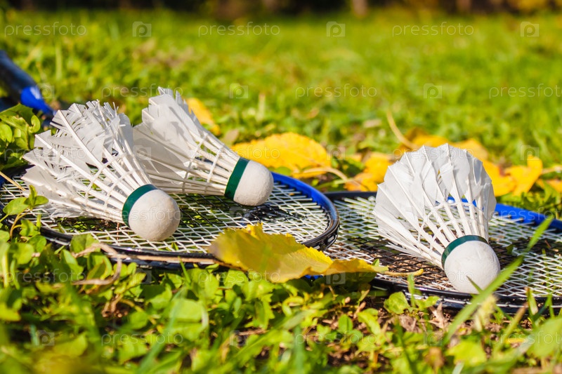 Две ракетки для бадминтона с тремя воланами лежат на траве. Крупный план