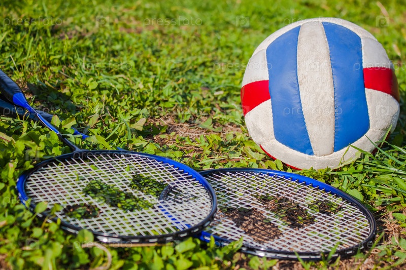 Волейбольный мяч и ракетки для бадминтона на траве