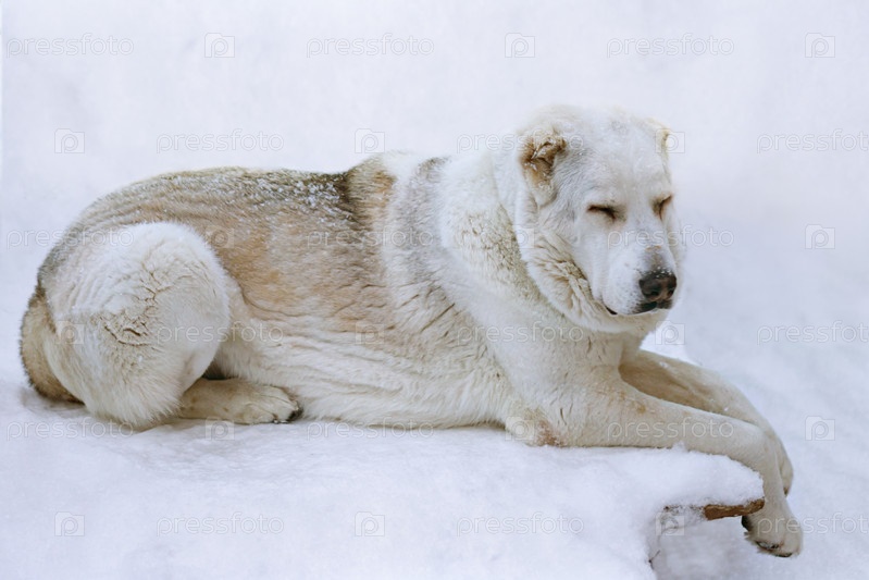 Белая среднеазиатская овчарка лежит на снежном фоне