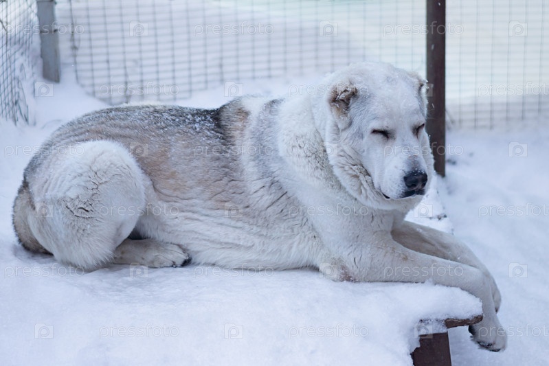 Белая среднеазиатская овчарка лежит на снежном фоне