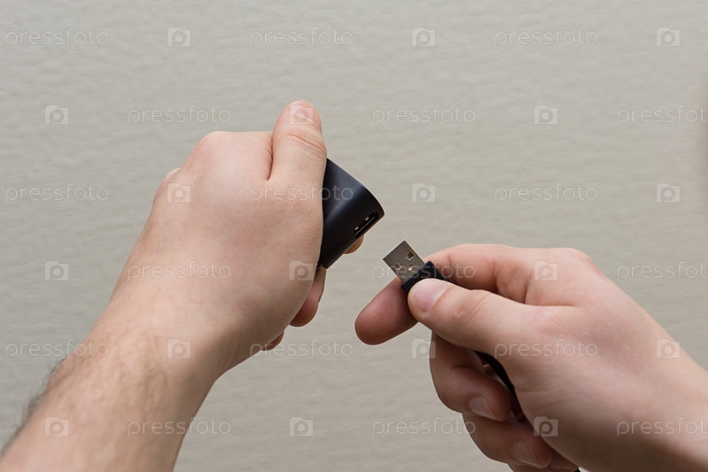 Мужчина втыкает провод