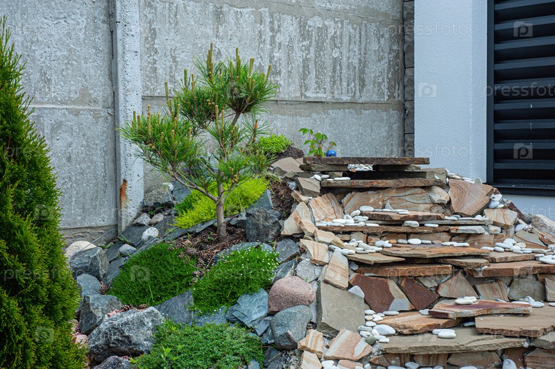Строительство большого круглого сада с альпийской горкой из камней и карликовых хвойников и круговой прогулочной дорожки
