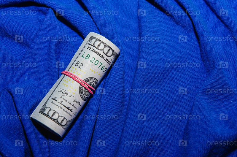 Долларовые купюры скручены в трубку, изолированную на синем фоне
