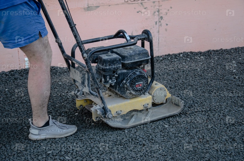 Работник дорожной службы утрамбовывает асфальт на огороженном участке проезжей части бензиновой виброплитой