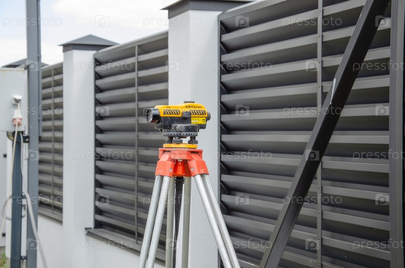 Перемещение уровня измерительного оборудования на штативе на строительной площадке