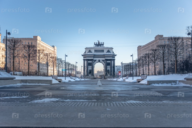 Москва, Россия - 02 февраля 2021 года: Триумфальная арка Москвы в ознаменование победы России над Наполеоном ночью