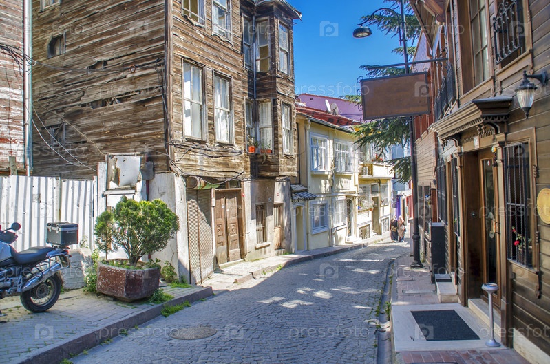 Улица Стамбула со старыми традиционными деревянными домами и филигранным тротуаром, Турция. Район Золотой Рог