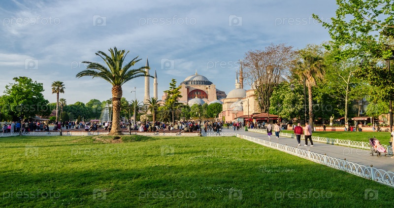Стамбул, Турция - 02 мая 2018 г.: Редакция: Собор Святой Софии вечером на фоне голубого неба весной в Стамбуле, Турция
