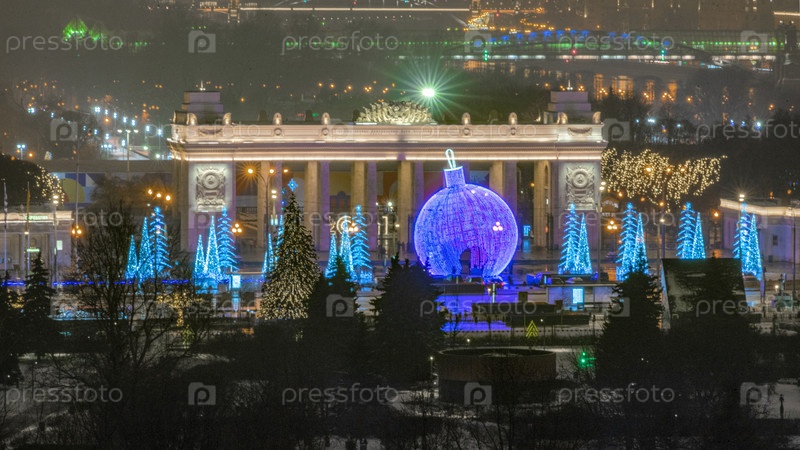 МОСКВА - 31 декабря 2020 г.: Ворота парка Горького ночью в Москве, Россия. Это центральный московский парк, расположенный в самом центре города