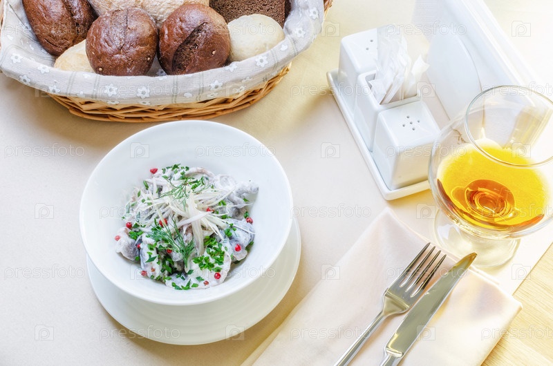Салат с шампиньонами и луком со сметанным соусом