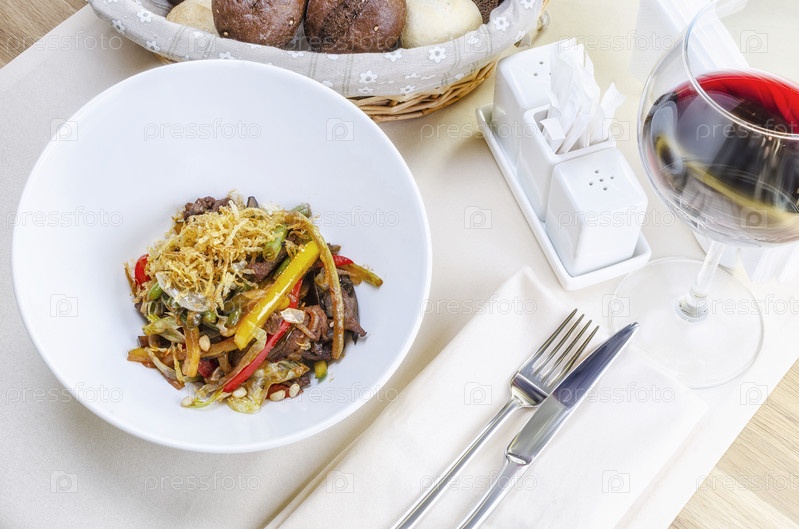 Салат с говядиной, перцем, фасолью и сушеным луком