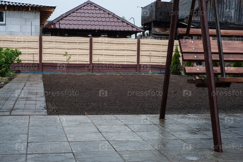 Деревянные летние качели на зеленой траве в саду. Украшение сада. Летний отдых за городом