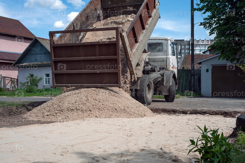 Самосвалы хорошо заполняют поле, создавая мелкую почву. Подготовка и строительство