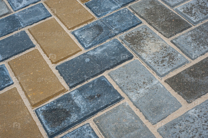 Тротуарная плитка разных цветов и форм. Текстура разноцветной узорчатой тротуарной плитки