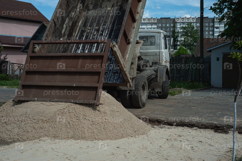 Самосвалы хорошо заполняют поле, создавая мелкую почву. Подготовка и строительство. Город