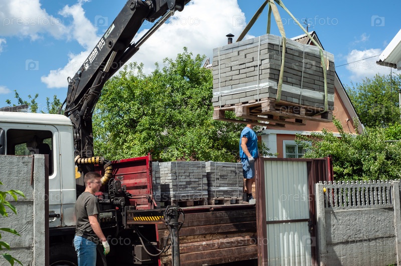 Выгрузка тротуарной плитки из грузовика. Мужчины разгружают тротуарную плитку с помощью манипулятора