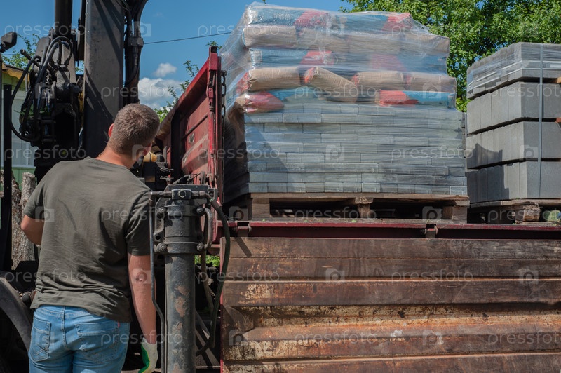 Выгрузка тротуарной плитки из грузовика. Мужчины разгружают тротуарную плитку с помощью манипулятора