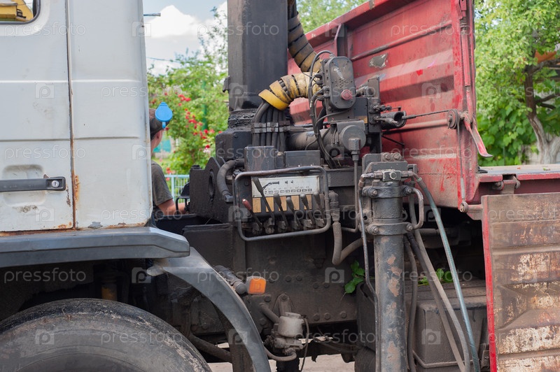 Выгрузка тротуарной плитки из грузовика. Мужчины разгружают тротуарную плитку с помощью манипулятора