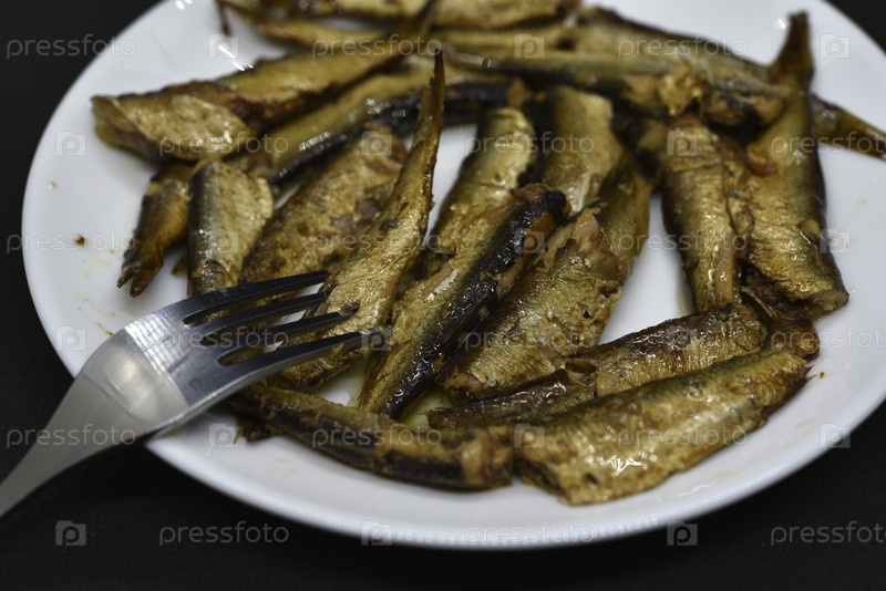 Рыбные консервы на белой тарелке. Шпроты и вилка. Рыба в масле. Завтрак из рыбы