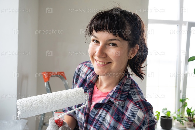 Счастливая женщина в малярном валике и белой краске для стен в руках портрет крупным планом. Строительные работы и косметический ремонт в доме, покраска стен, тонировка, отделочные работы своими руками