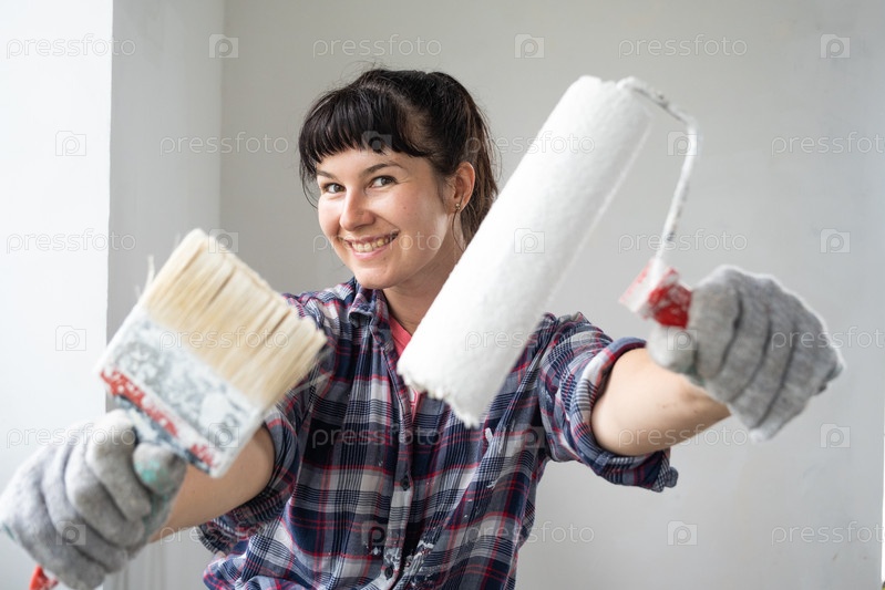 Счастливая женщина в малярном валике и белой краске для стен в руках портрет крупным планом. Строительные работы и косметический ремонт в доме, покраска стен, тонировка, отделочные работы своими руками