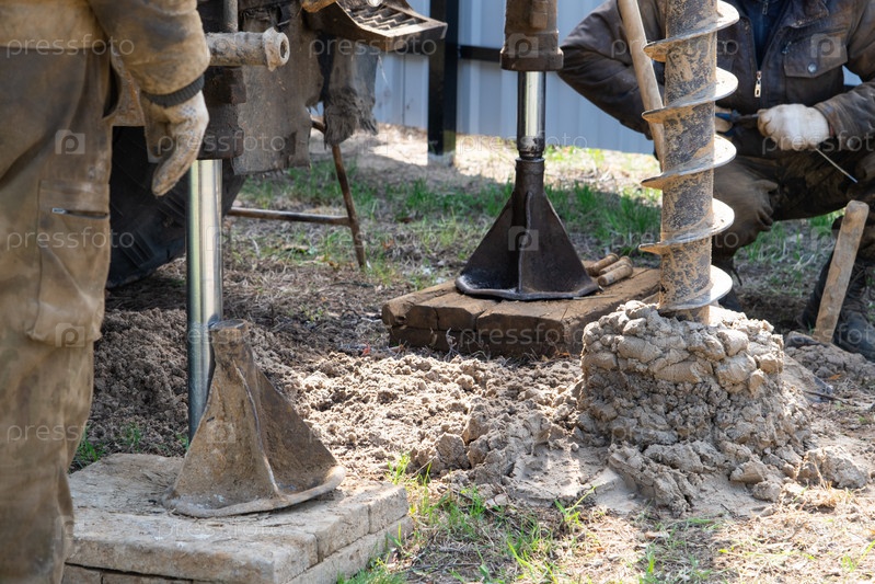 Бригада рабочих с буровой установкой на машине бурит артезианскую скважину для воды в земле. Закладка металлической обсадной трубы в землю, установка индивидуального питьевого водоснабжения, 28 июня 2022, Россия,