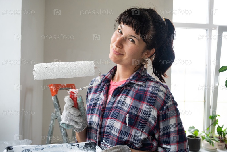 Счастливая женщина в малярном валике и белой краске для стен в руках портрет крупным планом. Строительные работы и косметический ремонт в доме, покраска стен, тонировка, отделочные работы своими руками