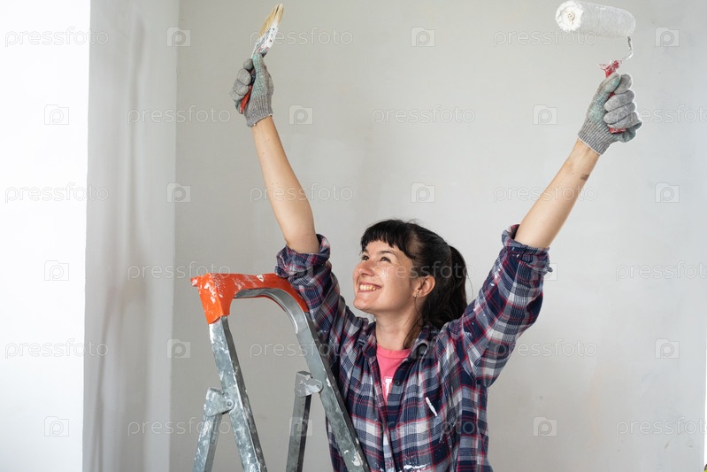 Счастливая женщина в малярном валике и белой краске для стен в руках портрет крупным планом. Строительные работы и косметический ремонт в доме, покраска стен, тонировка, отделочные работы своими руками