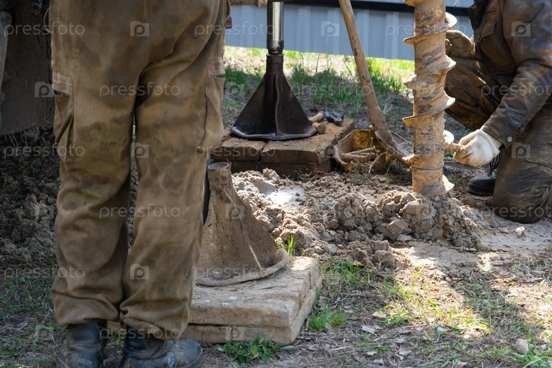 Бригада рабочих с буровой установкой на машине бурит артезианскую скважину для воды в земле. Закладка металлической обсадной трубы в землю, установка индивидуального питьевого водоснабжения, 28 июня 2022, Россия,