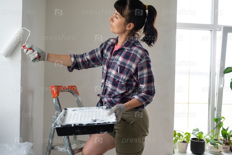 Женщина в малярном валике и белой краске красит стену дома на стремянке. Строительные работы и косметический ремонт в доме, покраска стен, тонировка, отделочные работы своими руками