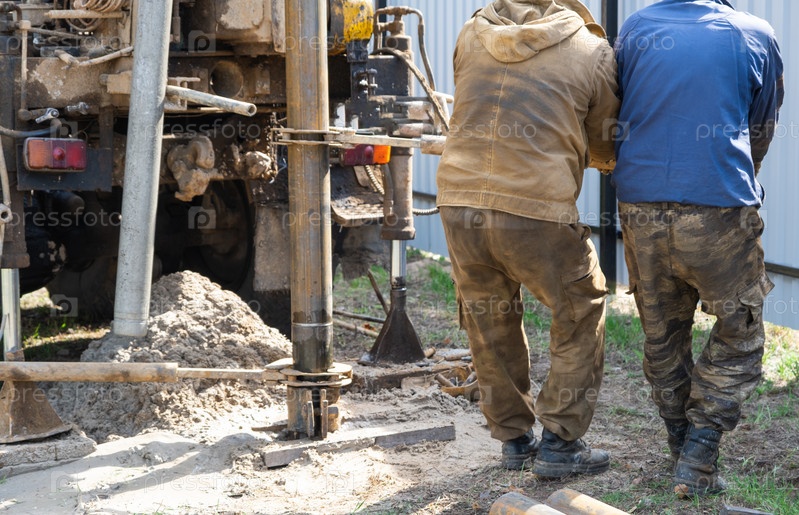 Бригада рабочих с буровой установкой на машине бурит артезианскую скважину для воды в земле. Закладка металлической обсадной трубы в землю, установка индивидуального питьевого водоснабжения, 28 июня 2022, Россия,