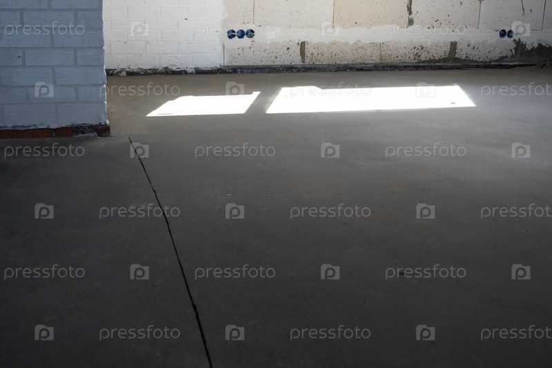 Выровненный черновой пол в строящемся доме с полусухой цементной стяжкой представляет собой гладкую поверхность с подсветкой из окон