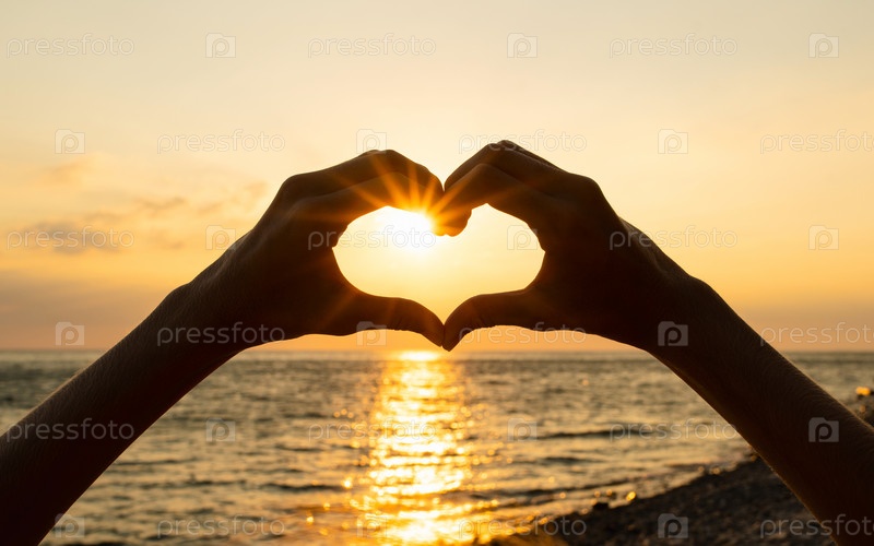 Человеческие руки показывают форму сердца на закате на фоне моря. Солнечные лучи на закате