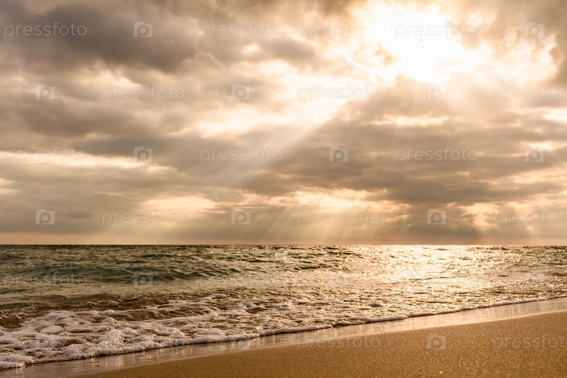 Красивый закат на берегу моря. Солнечные лучи пробиваются сквозь облака. Сосредоточение внимания на кромке воды