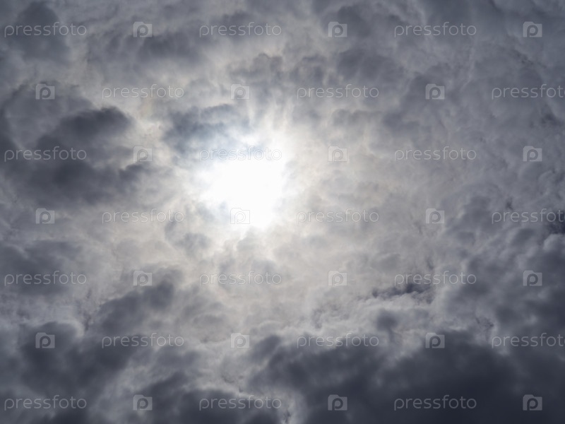Темные кучевые облака и бледное солнце, текстурированный облачный фон