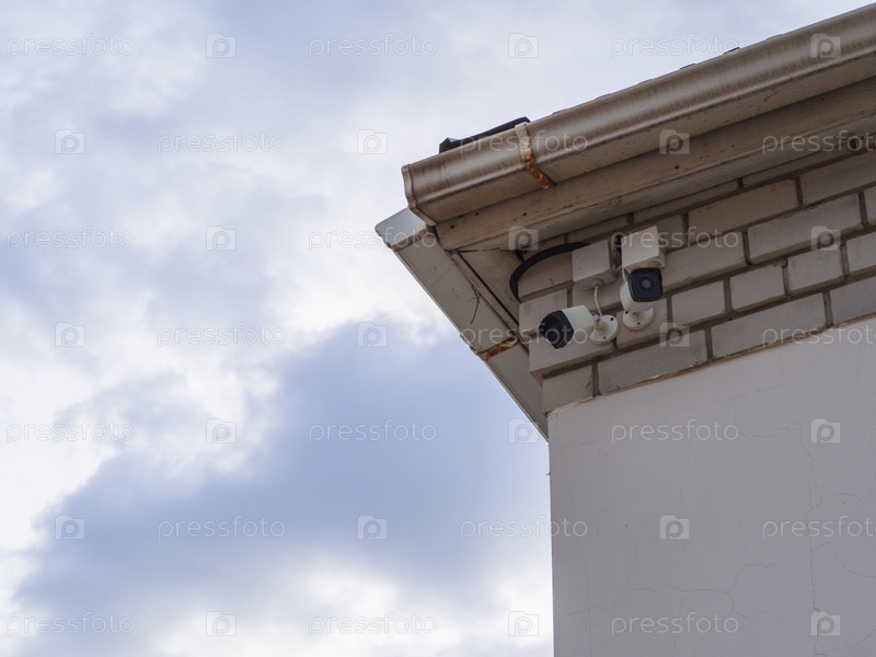 Камеры наружного наблюдения на старой стене под навесом крыши на фоне голубого неба. Наружное видеонаблюдение, камеры видеонаблюдения