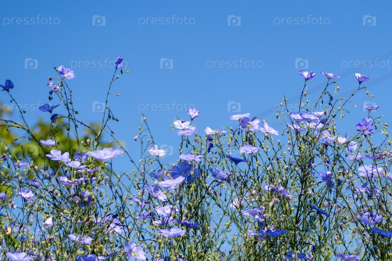 Маленькие нежные голубые цветы на фоне голубого неба. Цветение льна