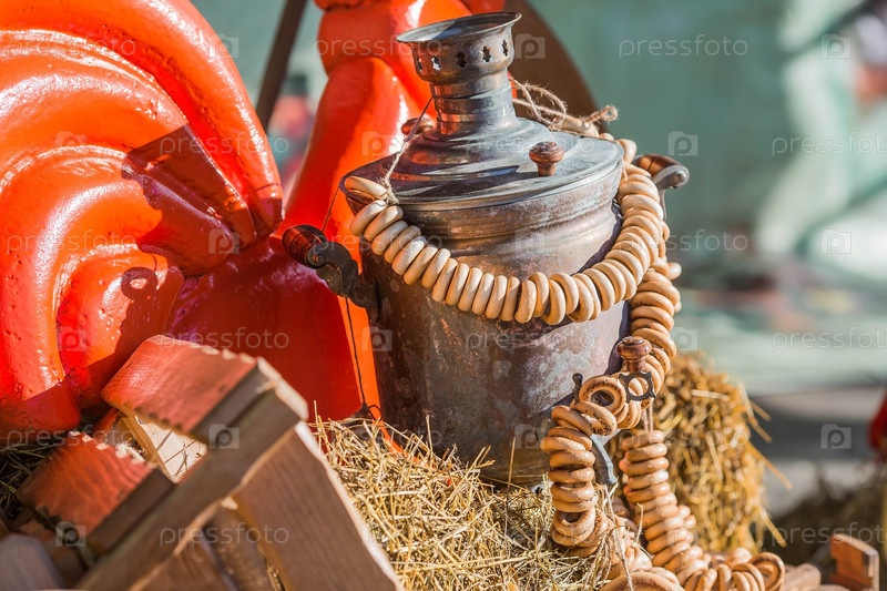 Московские сезоны. Украшения на Тверской улице в честь празднования традиционного русского праздника Масленица. Телеги, тележки, сено, бочки, самовары, рогалики, рогалики и елки с разноцветными лентами