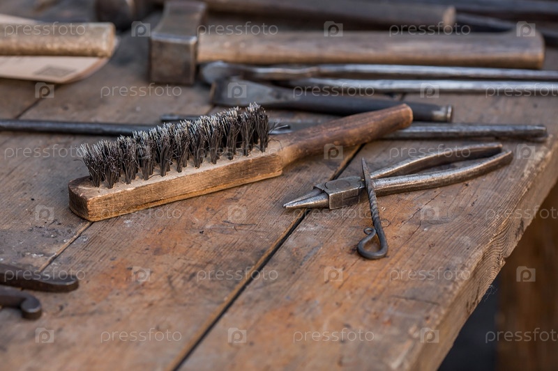 Московские сезоны. Традиционное ремесло. Работа кузнеца. Рабочие инструменты на деревянном столе. металла на праздновании Масленицы (Масленичной недели). Русские традиции. Тверская улица. Москва. Россия