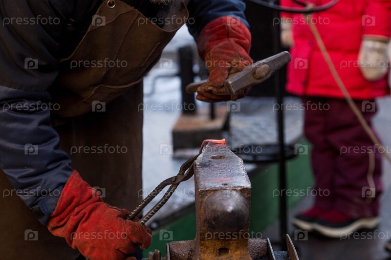 Московские сезоны. Традиционное ремесло. Работа кузнеца по металлу на праздновании Масленицы (Масленичной недели). Русские традиции. Тверская улица. Москва. Россия