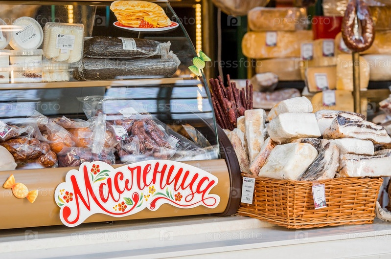 Московские сезоны. Торговые ряды на Тверской улице в честь празднования традиционного русского праздника Масленица. Прилавок с беконом и мясом