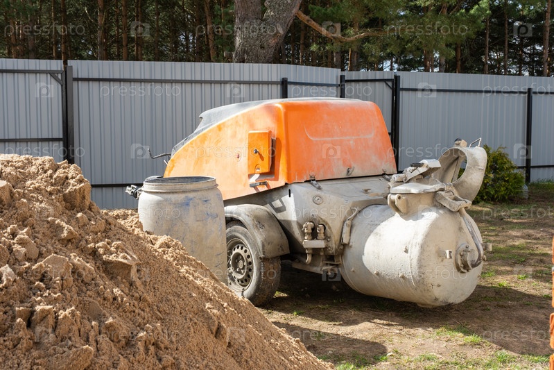 Установка с миксером для подачи цементной смеси для заливки полусухой стяжки пола в доме. Строительная площадка с горкой из песка, подготовка к выравниванию чернового пола коттеджа