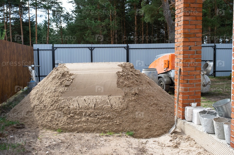 Установка с миксером для подачи цементной смеси для заливки полусухой стяжки пола в доме. Строительная площадка с горкой из песка, подготовка к выравниванию чернового пола коттеджа