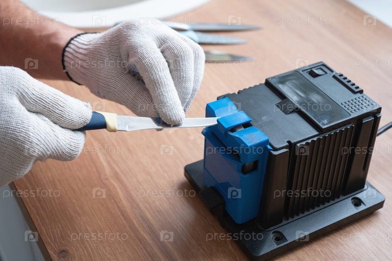 Заточка ножа на электроточилке в домашних условиях. Мужская рука загоняет лезвие ножа между синими точилками, на станок летит пыль