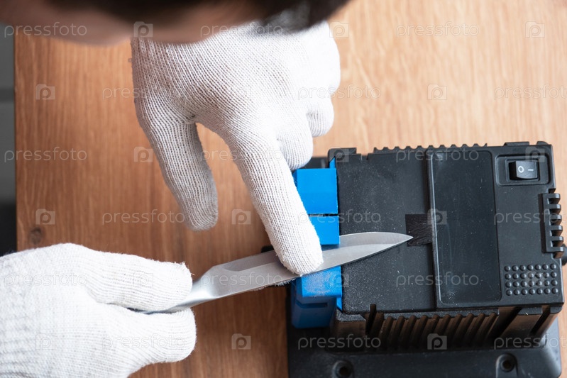 Заточка ножа на электроточилке в домашних условиях. Мужская рука загоняет лезвие ножа между синими точилками, на станок летит пыль
