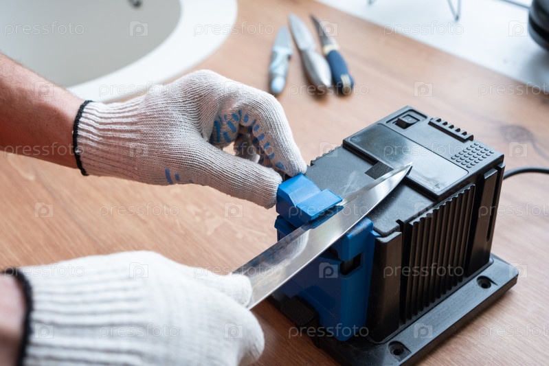 Заточка ножа на электроточилке в домашних условиях. Мужская рука загоняет лезвие ножа между синими точилками, на станок летит пыль