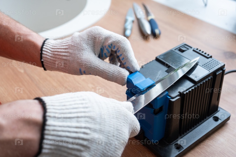 Заточка ножа на электроточилке в домашних условиях. Мужская рука загоняет лезвие ножа между синими точилками, на станок летит пыль