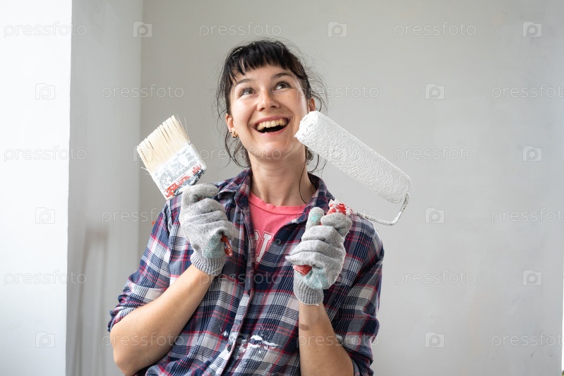 Счастливая женщина в малярном валике и белой краске для стен в руках портрет крупным планом. Строительные работы и косметический ремонт в доме, покраска стен, тонировка, отделочные работы своими руками