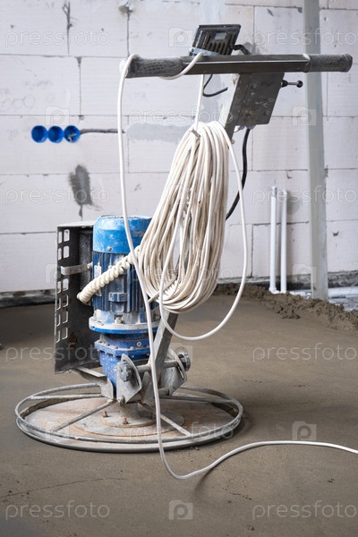 Утрамбовка и шлифовка полусухой стяжки пола машиной с вращающимся диском для выравнивания. Устройство бетонного пола в доме, мастер со спецтехникой