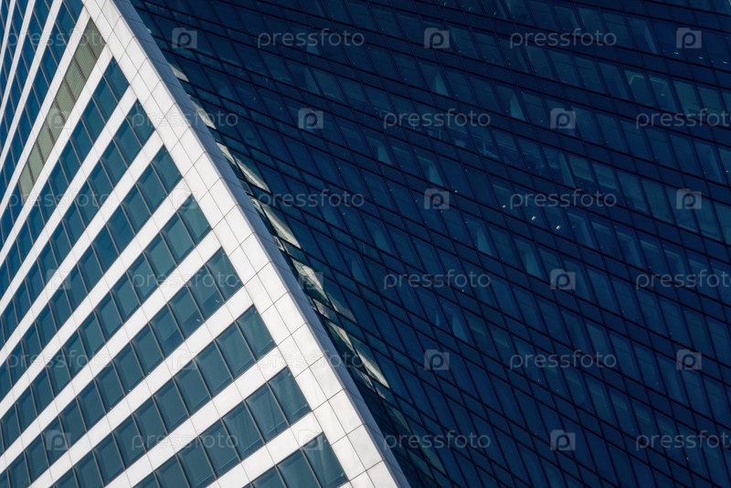 Футуристическая часть дизайна небоскребов на фоне ясного голубого неба. Абстрактный дизайн фасада. Стекло и металл в современной городской архитектуре. Внешний вид современных зданий. Строительная индустрия. Абстракция